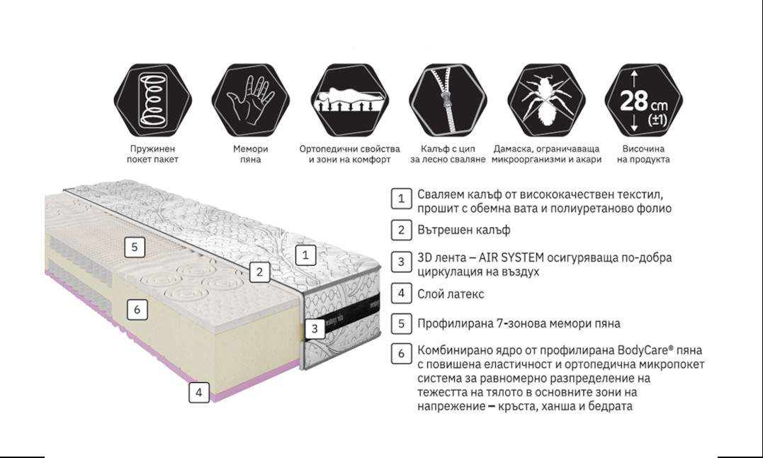 -Микропокет пружинна система – индивидуална поддръжка и минимално предаване на движение -Ядро от BodyCare® пяна – стабилност и дълготрайност -Слой естествен латекс – еластичност и антибактериални свойства -7-зонова профилирана мемори пяна – адаптация към извивките на тялото -Отлична вентилация на ядрото – свежа и суха среда на сън -Натоварване: до 110 кг за единичен размер