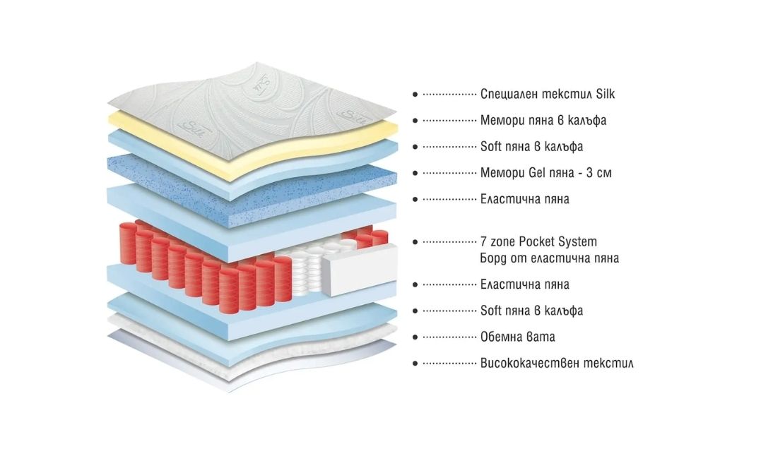 Silk Hybrid е двулицев матрак, създаден за тези, които търсят персонализиран комфорт и стабилна ортопедична поддръжка. Комбинацията от Pocket пружини със 7 зони и Memory Gel пяна осигурява адаптивна опора, която следва извивките на тялото и намалява напрежението в ключови точки през нощта — за по-спокоен и възстановяващ сън.