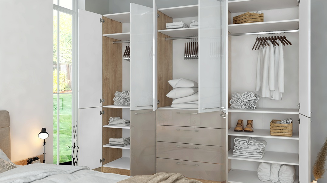 Изчистеният дизайн на гардероб Ava комбинира модерна визия и практично вътрешно разпределение. Съчетавайки светлия блясък на белите гланцови врати с топлия дървесен нюанс Gold Harbor Oak, той внася светлина и уют във всяка спалня.