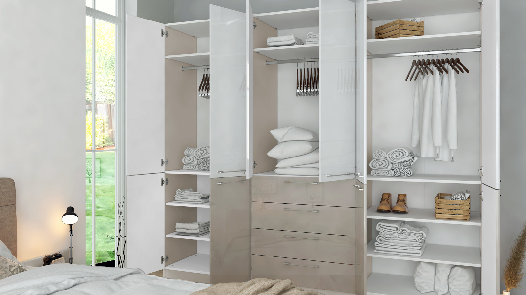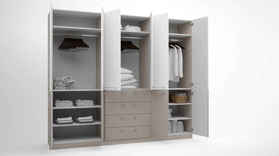 Гардероб Ava предлага стилна и хармонична комбинация от бял корпус, врати в кашмир, елегантен бял гланц и допълнение от делукс гланц, която създава усещане за изтънченост и модерен уют във всяка спалня. Перфектен избор за тези, които ценят светлите и спокойни интериори с функционално пространство.