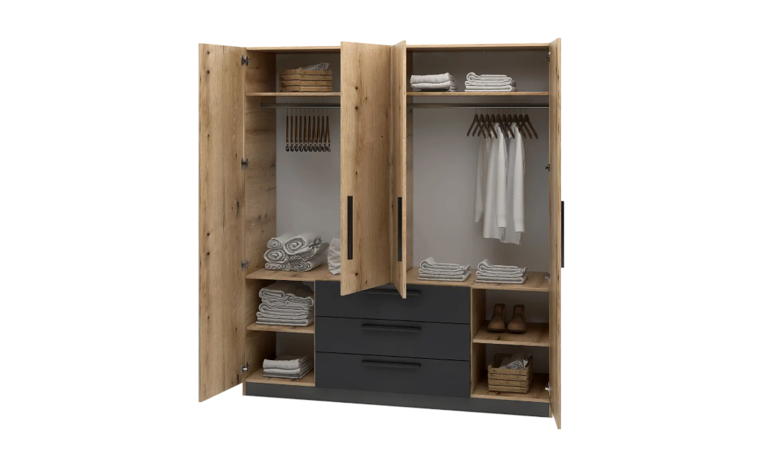 Гардероб Maximo съчетава топлия дървесен нюанс на coast evoke oak с елегантния тъмен акцент anthracite, създавайки стилен и съвременен дизайн. Идеален избор за модерни интериори, в които се търси баланс между естествена визия и индустриална естетика.