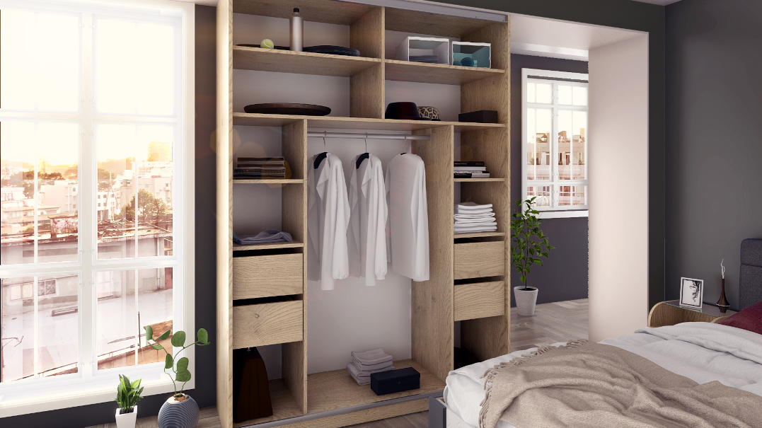 ✔ Просторно вътрешно разпределение с рафтове и лост за дрехи