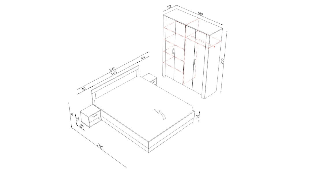 Комплектът включва: Легло с табла и повдигащ механизъм (за матрак 160 × 200 см) Две нощни шкафчета Гардероб с 4 врати, централно огледало и вътрешно разпределение