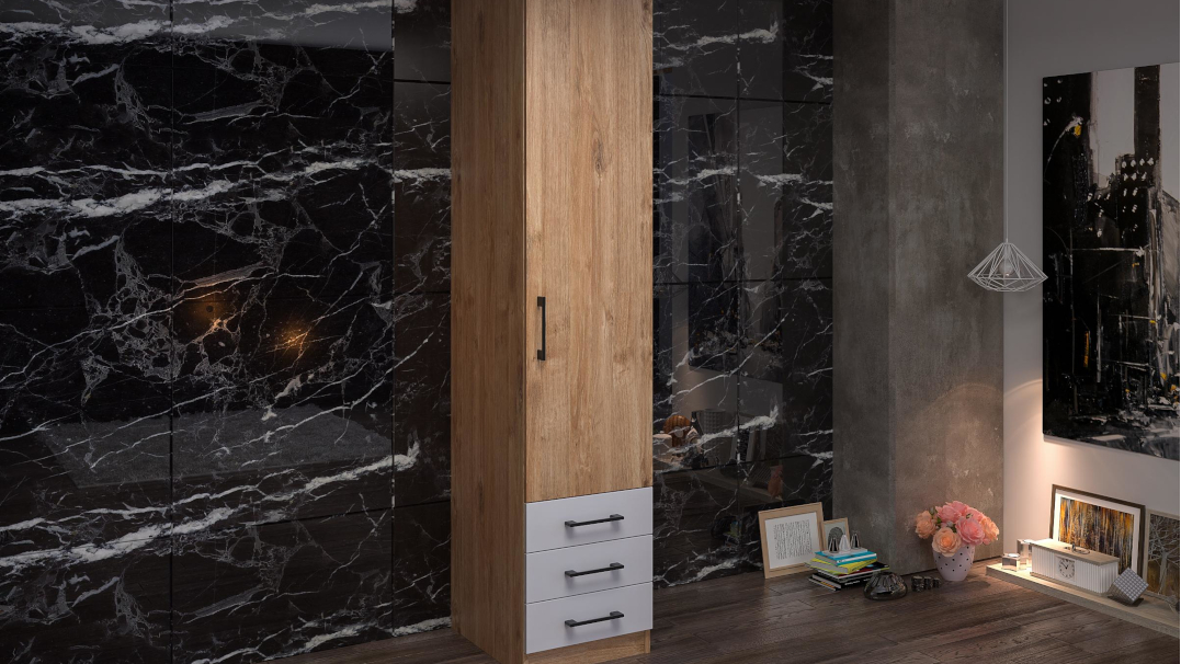 Integra е практично и стилно решение за съвременни спални, където всеки сантиметър има значение. Съчетавайки топлата дървесна текстура на gold harbor oak с лъскавите акценти в white gloss MDF, този комплект внася уют и светлина в помещението, без да прави компромис с функционалността.