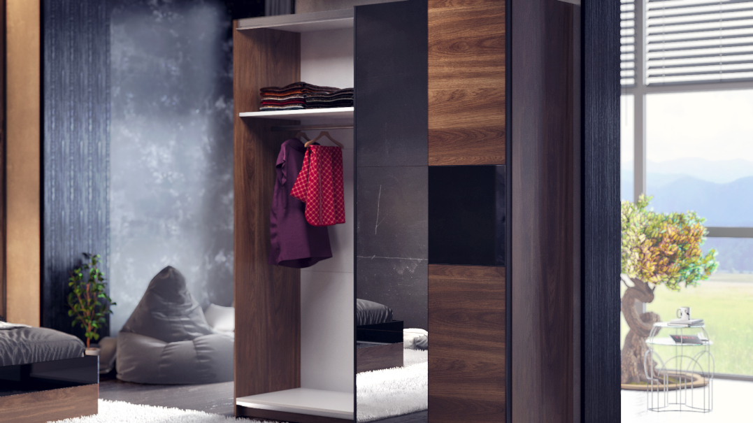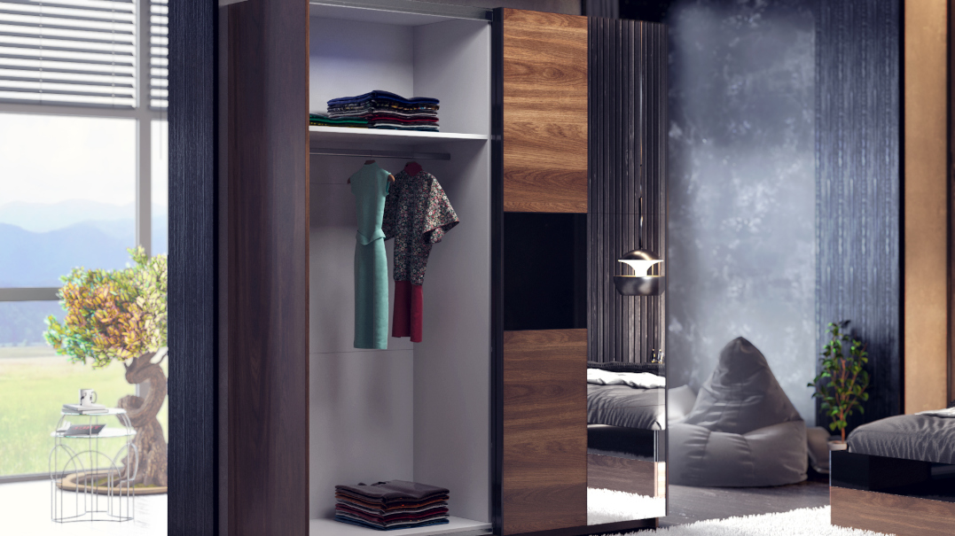 – Гардероб с плъзгащи врати, комбиниращ дървесен декор и