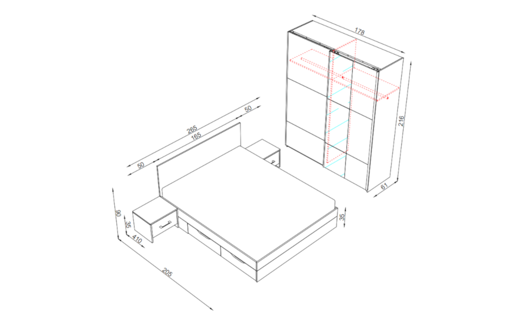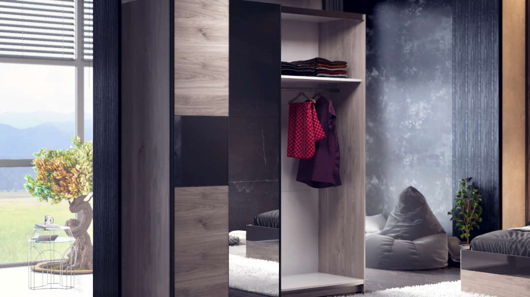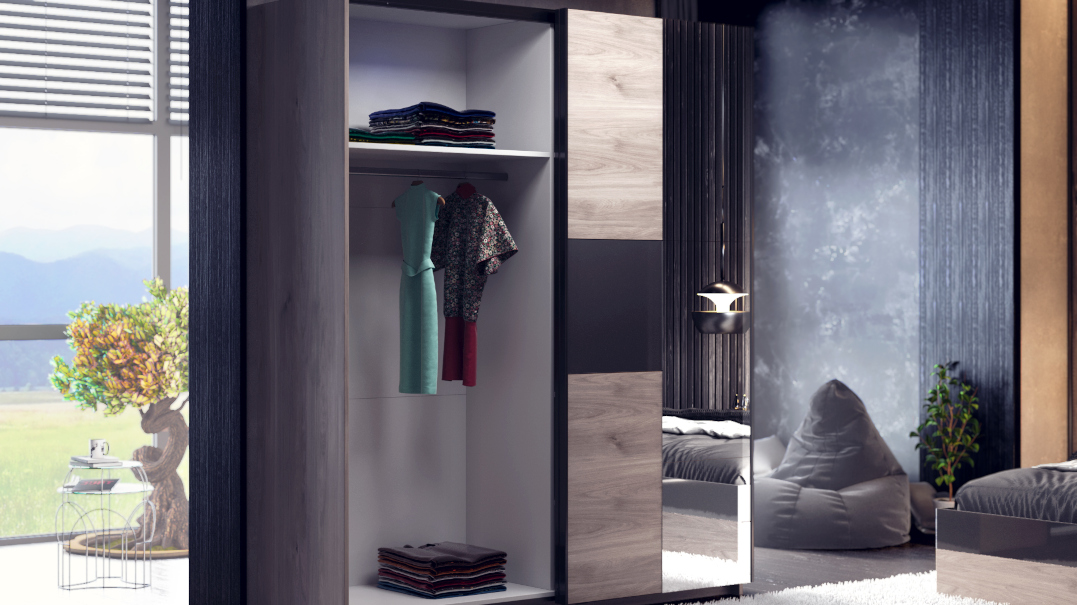 Комплектът включва: – Легло с чекмеджета, предназначено за матрак 160 × 200 см – Два нощни шкафчета – Гардероб с плъзгащи врати и огледало – с вътрешно разпределение, подходящо за оптимално съхранение