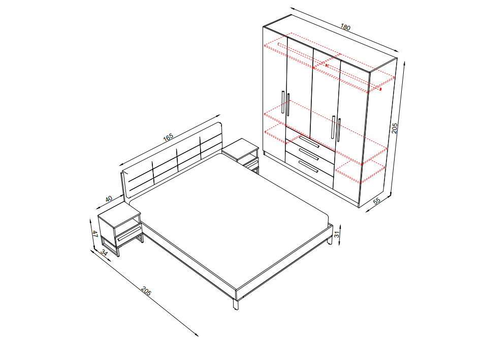 Комплектът включва: – Легло с табла и основа (предназначено за матрак 160 × 200 см) – 2 бр. нощни шкафчета – Гардероб с практично разпределение – Скрин (по избор)