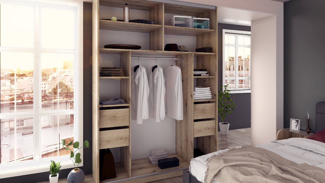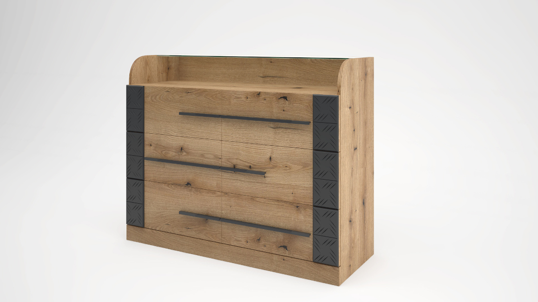 Modena впечатлява с балансиран дизайн, съчетаващ стилна геометрия, изчистени форми и тапицирана табла за максимален уют. Декоративните елементи върху леглото и гардероба добавят текстура и характер, превръщайки комплекта в изразителен акцент във всяка съвременна спалня. Комбинацията от coast evoke oak и anthracite придава модерен индустриален дух, съчетан с естествена топлина.