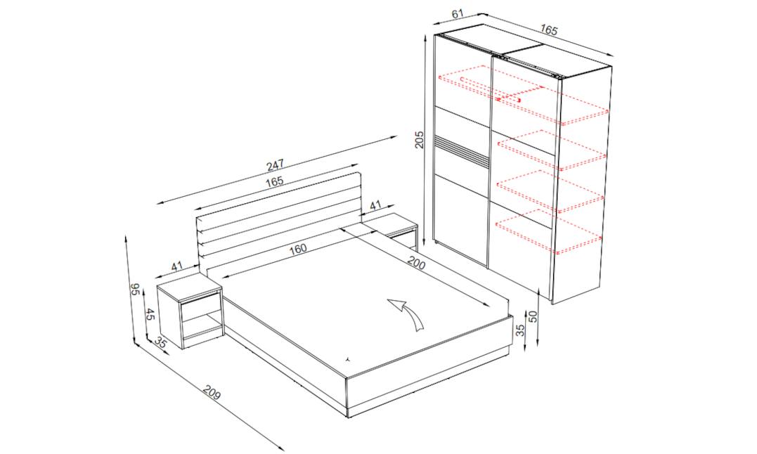 ✔ Легло, предназначено за матрак 160 × 200 см ✔ Гардероб с плъзгащи врати и огледало, черен гланц и хоризонтални детайли ✔ Нощни шкафчета с открита ниша и чекмедже ✔ Тапицирана табла – мекота и елегантност ✔ Всички артикули могат да бъдат закупени и поотделно ✔ Размерите на всички модули са посочени в продуктовите изображения