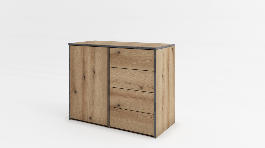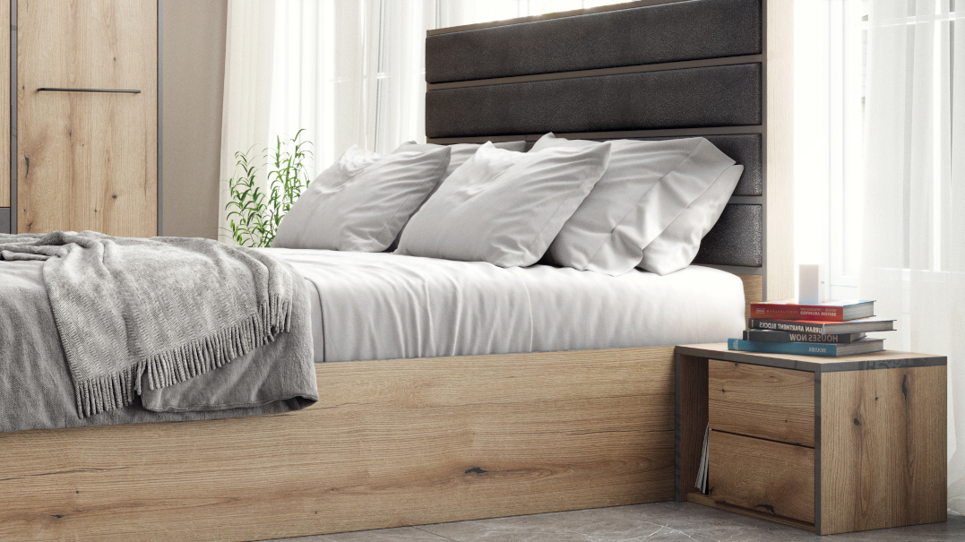 Toledo впечатлява със съвременно излъчване и елегантно присъствие. Комбинацията от coast evoke oak и акценти в gloss създава модерен контраст между естествена дървесна текстура и изискан графитен блясък. Вертикалната тапицирана табла носи усещане за комфорт и завършеност, а изчистените линии подчертават индустриалната елегантност на модела.