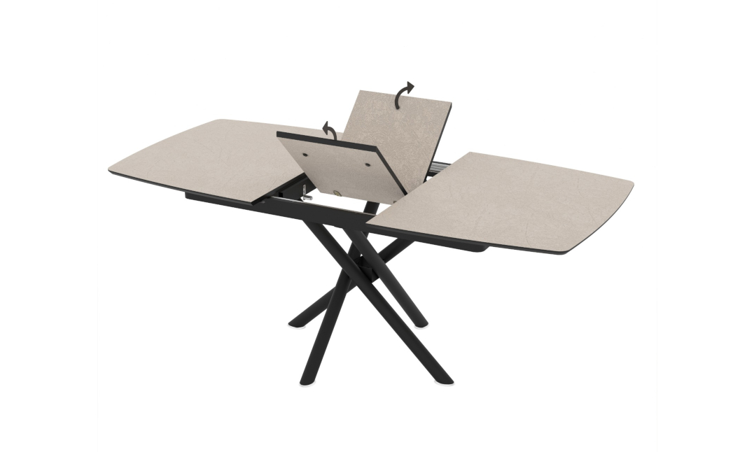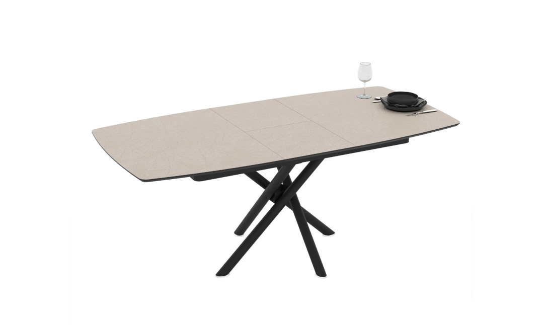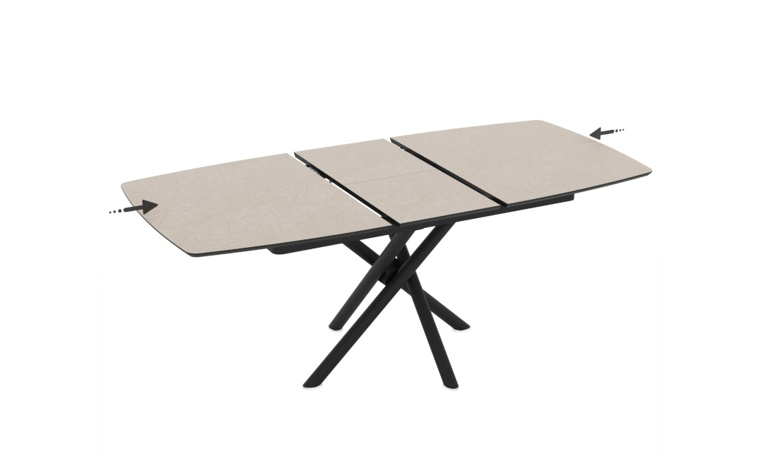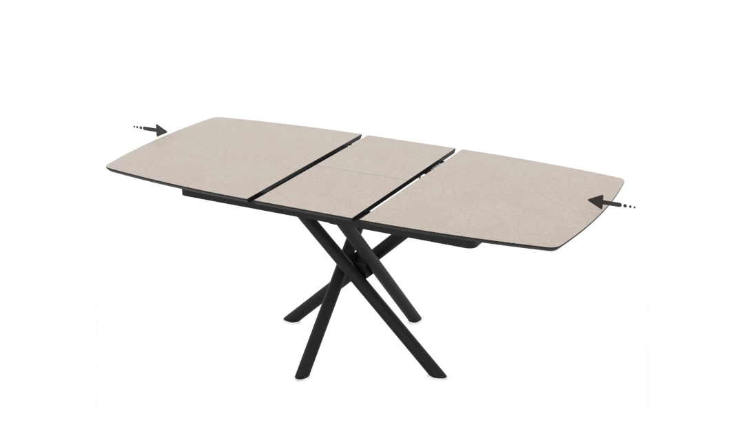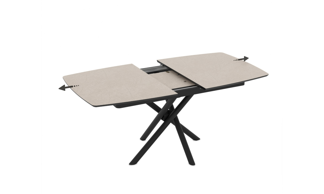Благодарение на скрит разтегателен механизъм, масата лесно се разширява, за да осигури допълнително място за гости или семейни събирания. Кръстосаната метална основа придава модерен характер и стабилност на цялата конструкция.