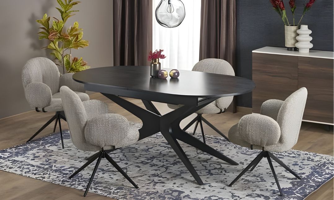 Моделът SANDRO е въплъщение на модерния лукс в трапезарията. С елегантен черен цвят и овален плот, масата носи изчистена, но силно въздействаща визия. Атрактивната ѝ основа с геометричен дизайн гарантира стабилност и визуален акцент, който приковава вниманието.