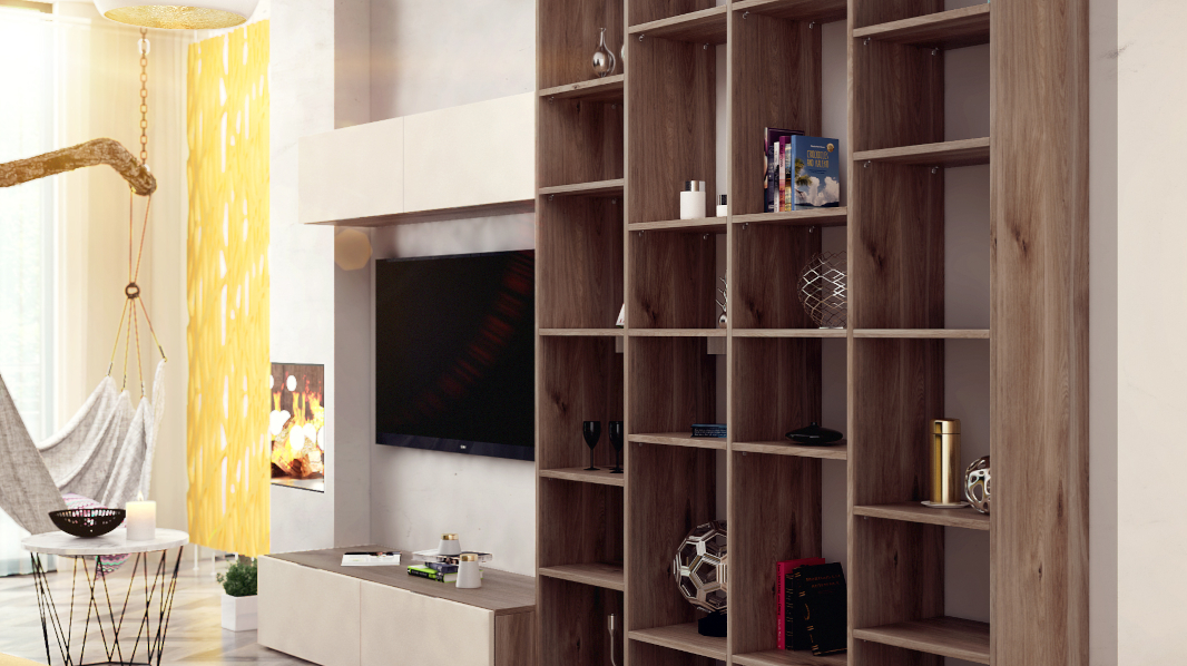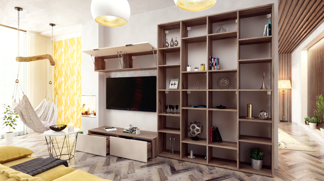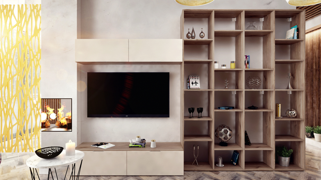– Отворени рафтове за книги, декорации и акценти – Затворени шкафове и чекмеджета за стилно скрито съхранение – Горен модул с хоризонтално отваряне за оптимално използване на вертикалното пространство – ТВ отделение с нисък профил и добре интегриран в цялостната композиция