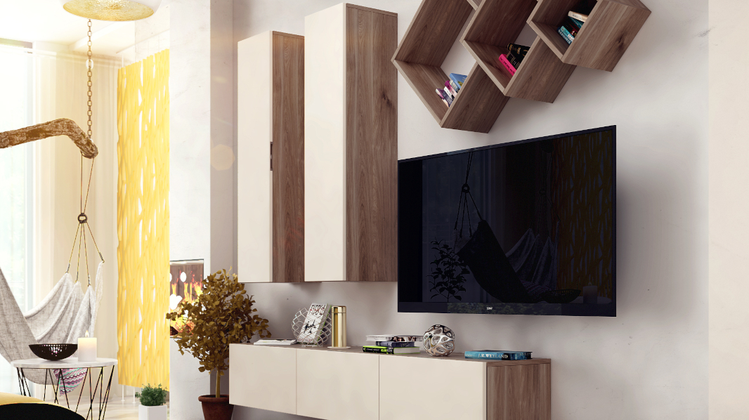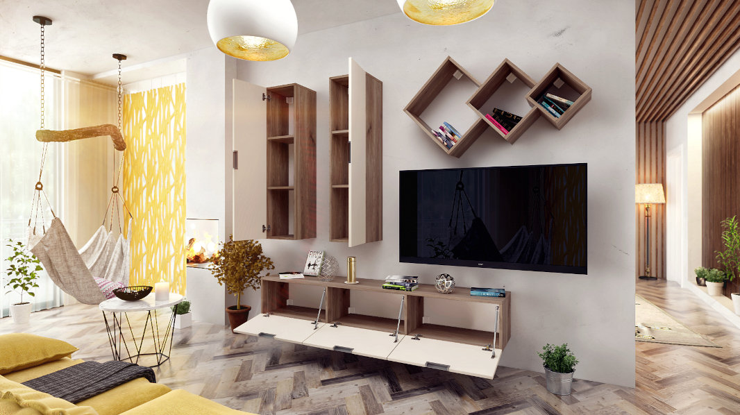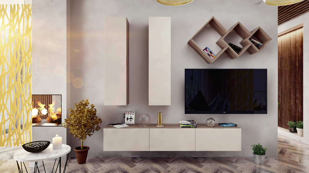 – Отворени пространства за книги, декорации и акценти – Затворени шкафове и чекмеджета за стилно скрито съхранение – Горен модул с хоризонтално отваряне за оптимално използване на вертикалното пространство – ТВ отделение с нисък профил и добре интегриран в цялостната композиция