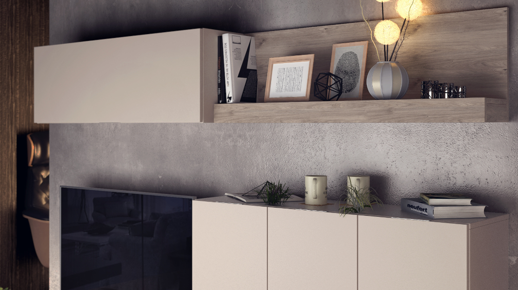 – Открити ниши, подходящи за декорации, растения и декоративни акценти – Затворени шкафове и чекмеджета за скрито съхранение на вещи – Горен модул с хоризонтално отваряне, който оптимизира използването на вертикалното пространство – ТВ зона с органичен дизайн, който се вписва плавно в цялостната композиция